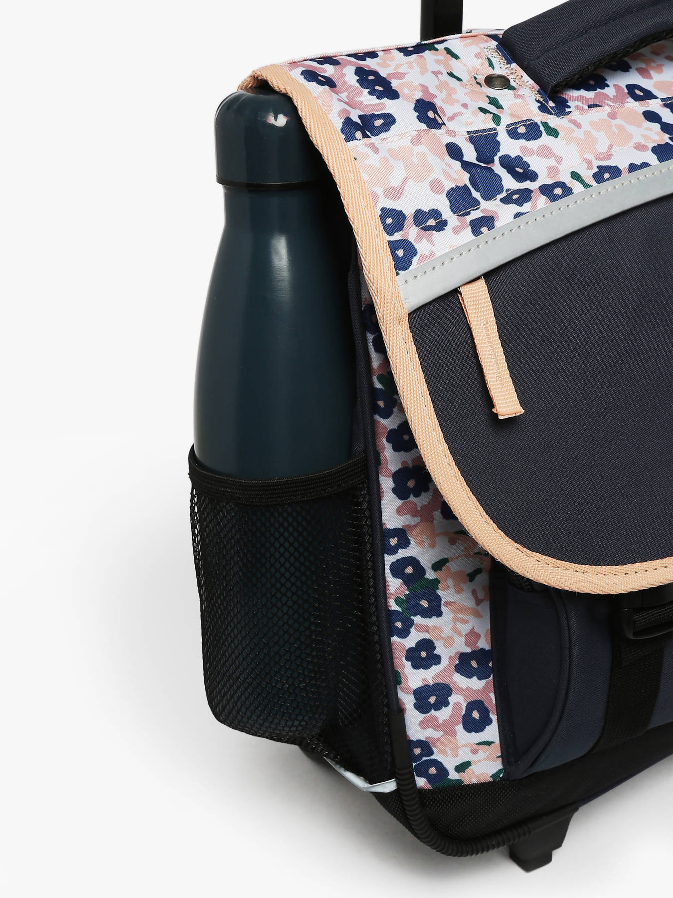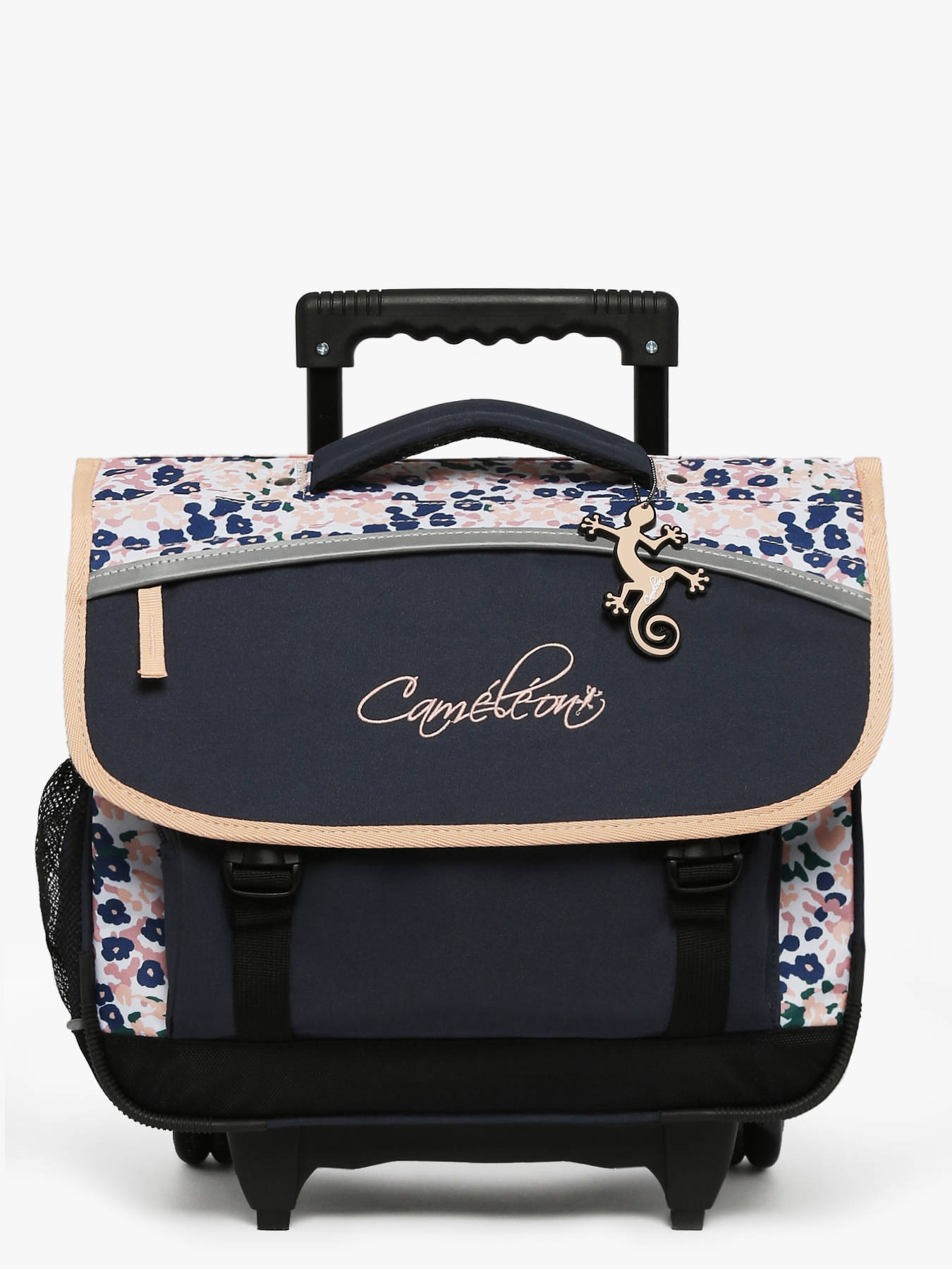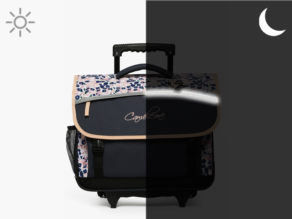 38 cm - 15 litres - 2.3 kg ~ Cartable enfant à roulettes 38 cm de la ligne Actual signé Caméléon. Convient parfaitement pour les classes de CP, CE1 et CE2. Son intérieur comporte deux compartiments, parfaits pour accueillir les cahiers format 21x29,7 cm, 24x32 cm et les classeurs A4. Une grande poche zippée ainsi qu’un emplacement spécial règle sont également intégrés. Ce cartable se ferme à l’aide d’un rabat et de deux fermoirs solides. Il dispose de deux poches extérieures à fermeture éclair, pratiques pour le goûter et les petits effets personnels. Un emplacement pour la gourde est prévu sur le côté. Confortable et résistant, le dos et les bretelles sont rembourrés, et le fond est renforcé. Pour passer en mode trolley, les bretelles peuvent être rangées dans une poche prévue à l’arrière du cartable. Une protection rembourrée au dos a été pensée pour éviter tout contact direct avec l’armature des roues et protéger le dos des enfants. Ce cartable est fabriqué en polyester recyclé imperméable. Côté sécurité, des bandes réfléchissantes sont placées autour du cartable. Petit plus : une règle est offerte !